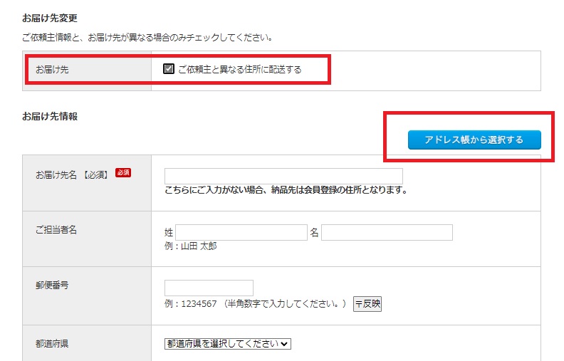 アドレス帳を使用する際は、商品をカートに入れた後、注文情報入力ページで「お届け先」の「ご依頼主と異なる住所に配送する」にチェックを入れます。