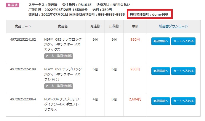入力いただいた独自発注番号は、注文照会ページ・納品書・請求書にカワダオンラインの発注番号と併せて記載いたします。